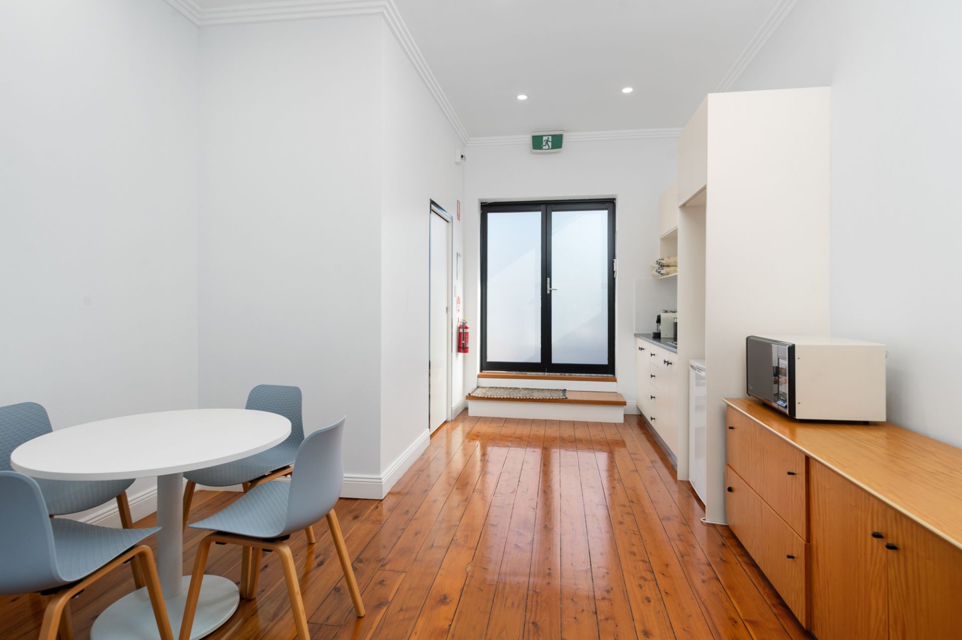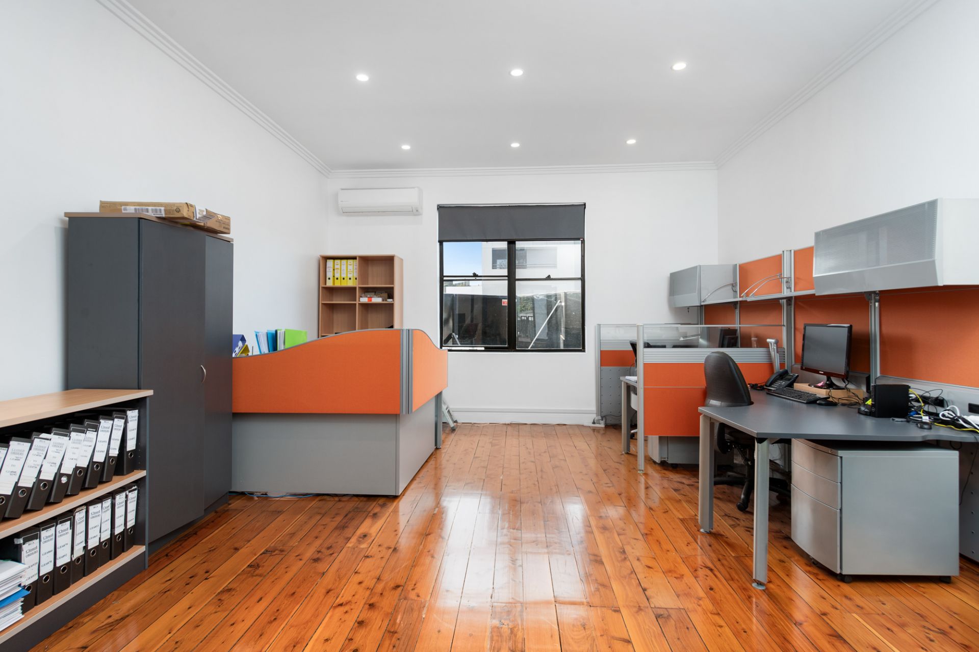 First floor office with timber floors, high ceilings, downlights & RC/AC