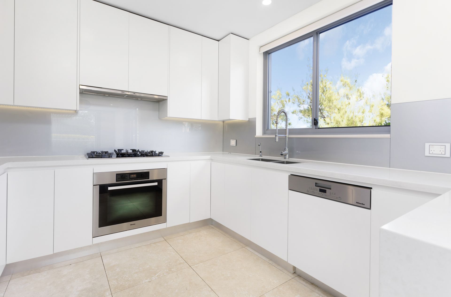 + Gourmet gas kitchen with stone benchtops, glass splashback, and premium Miele appliances.