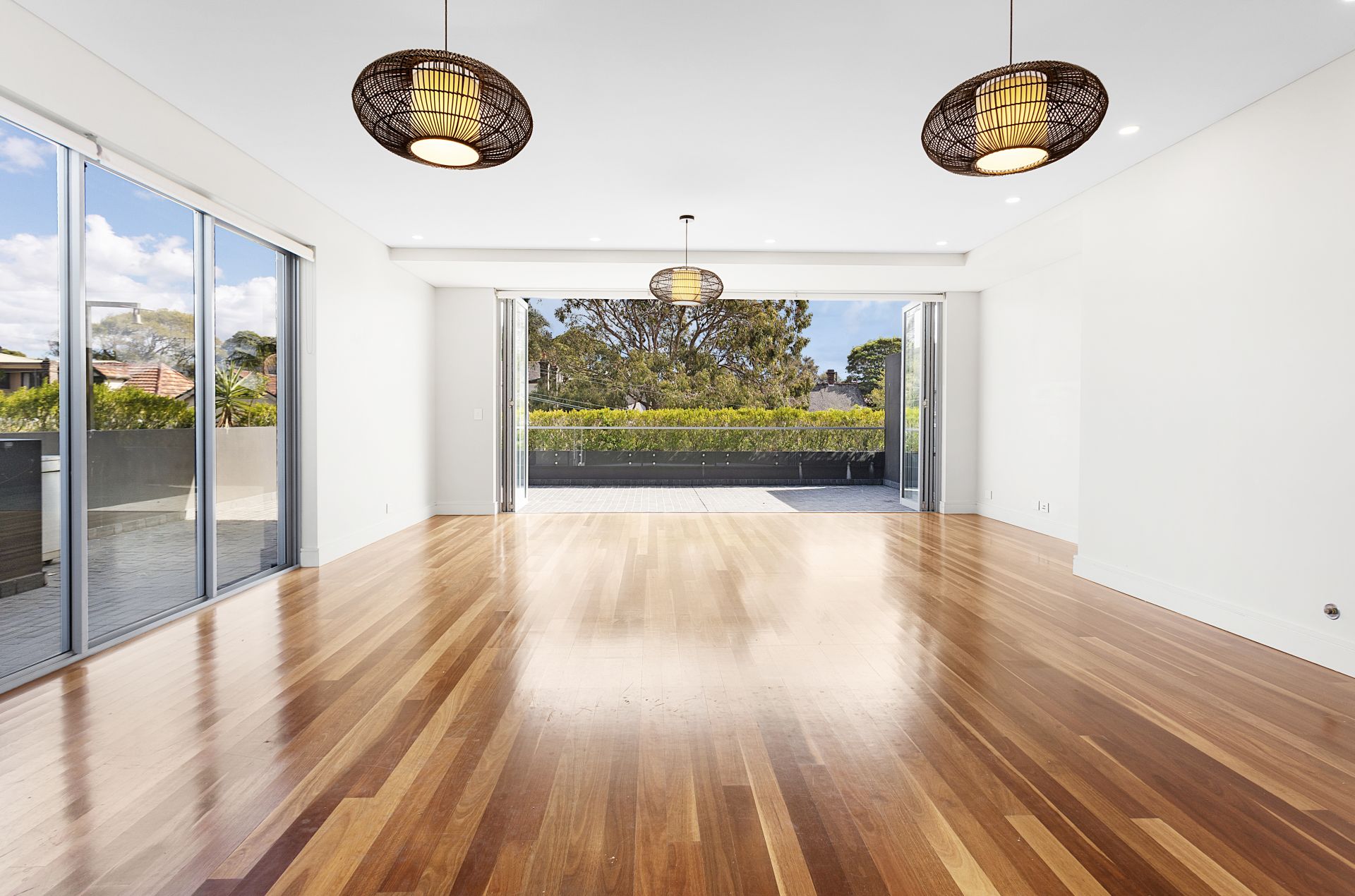 + Expansive open-plan living & dining with polished timber floors and floor-to-ceiling windows on two sides, flooding the space with natural light.
